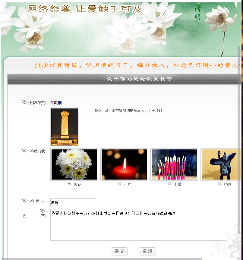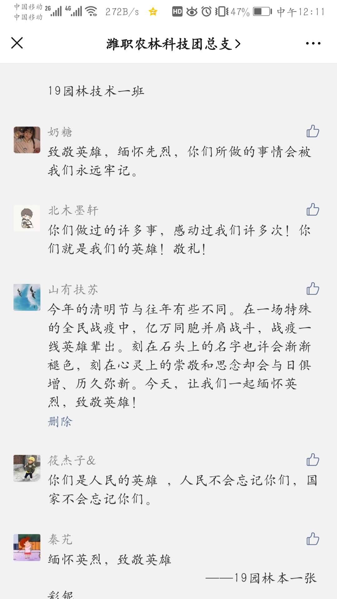 在本次活动中,各团支部纷纷开展了“缅怀先烈”、“致敬英雄”、“文明祭扫”、“抗疫分享”等主题的线上团课并组织同学们去“潍坊之窗”网站及“潍职农林科技团总支”公众号进行缅怀纪念。员工们通过线上为英烈献花、点烛、祭拜、寄语留言的方式,表达了对革命英烈和在此次抗击新冠肺炎疫情斗争中牺牲烈士的缅怀和纪念。