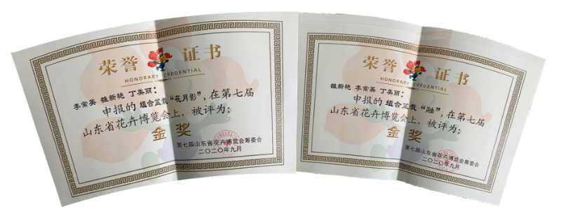 近日,由中国花卉协会盆栽植物分会、山东省林木种苗协会主办,青州市花卉协会承办的第七届山东省花卉博览会在青州举办,期间同步举办组合盆栽比赛项目。公司雒新艳、李常英、丁美丽三位老师的作品《融》和《花月夜》荣获此次赛事最高奖——金奖。