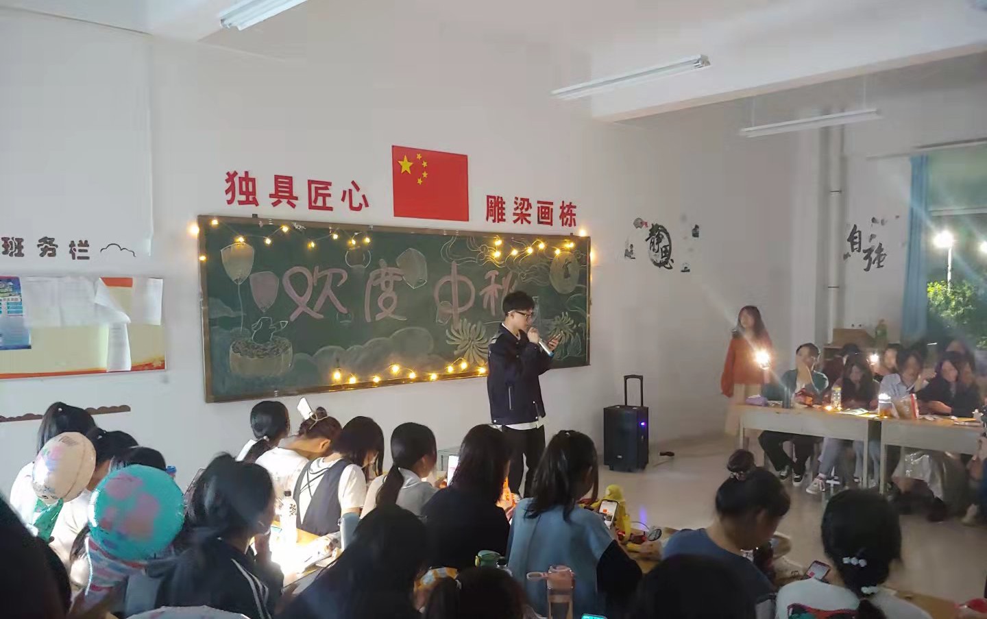 本次活动主要以班级为单位,各班级围绕主题设计方案,在各自教室开展活动。打扫教室、布置桌椅、制作板报,筹备节目,同学们忙得不亦乐乎。晚会中,有班级通过诵读中华经典,讲解中秋节的来历、传统习俗,感受中国传统节日所蕴含的深厚文化内涵;有班级同学们各显才艺,载歌载舞,营造出了浓厚的民族节日氛围;教师们也在晚会上一展歌喉,同学们围坐成一圈打开手电筒轻声合唱,还有学长学姐们表演唱歌跳舞节目为新生晚会助阵。晚会期间,各班级分发印有校徽的月饼,品月饼赏圆月,员工们脸上洋溢着幸福的笑容。整个活动师生同堂欢庆,歌声、乐声、欢笑声充斥着整个校园,使得今年的中秋佳节为潍职校园增添了别具一格的温馨氛围。