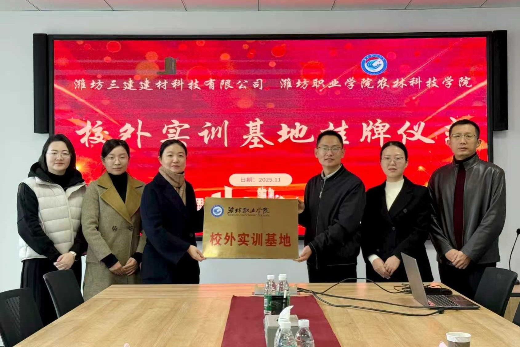 在潍坊三建集团相关负责人的陪同下,公司一行实地参观了企业的房建及市政装配式构件生产车间、技术监控中心与成果展示区,深入了解企业在建筑工业化、绿色建造、智能制造等领域的发展历程、核心技术与未来战略规划。参观结束后,双方共同为“农技小院”和“校外实训基地”挂牌。随后,双方围绕专业建设、人才培养模式、运行机制及模块化课程开发等议题展开座谈交流,并就进一步推动校企协同育人达成多项共识。